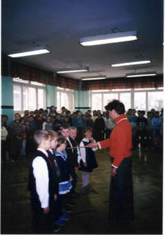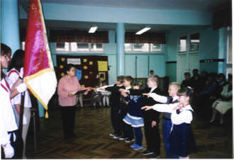 ogromnym przejęciem, z wyciągniętą rączką ku szkolnemu sztandarowi,