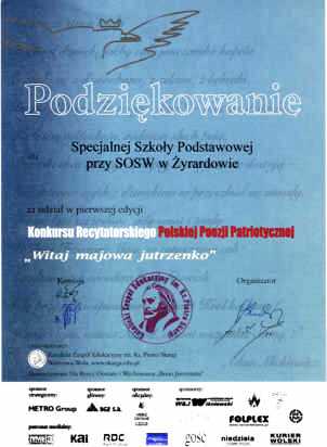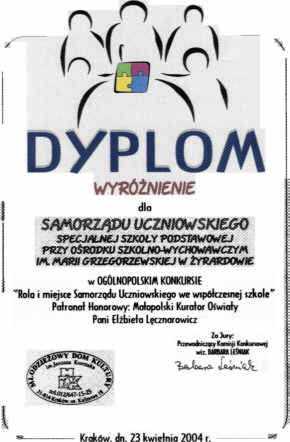 Samorząd Uczniowski naszej szkoły wziął udział w Ogólnopolskim Konkursie „Rola i miejsce Samorządu Uczniowskiego we współczesnej szkole”. Organizatorem konkursu było Kuratorium Oświaty w Krakowie oraz Młodzieżowy Dom Kultury im. Janusza Korczaka w Krakowie. Współorganizatorem było Stowarzyszenie im. Janusza Korczaka w Krakowie oraz Polskie Stowarzyszenie im. Janusza Korczaka w Warszawie. Patronat honorowy nad konkursem objął Małopolski Kurator Oświaty - Pani Elżbieta Lęcznorowicz. Powyższy konkurs był ciekawym pomysłem upowszechniania i wspierania wszelkich inicjatyw podejmowanych przez młodzież działającą w Samorządach Uczniowskich. Pozwolił na prezentację twórczej aktywności młodych ludzi, przedstawienie ich dorobku oraz wymianę doświadczeń pomiędzy szkołami. Wykonaliśmy plakat informujący o najciekawszych inicjatywach podejmowanych przez SU na terenie naszej szkoły, załączyliśmy też opis tych przedsięwzięć. Nasza praca została zauważona przez jurry i wyróżniona dyplomem. kwiecień 2004r. |